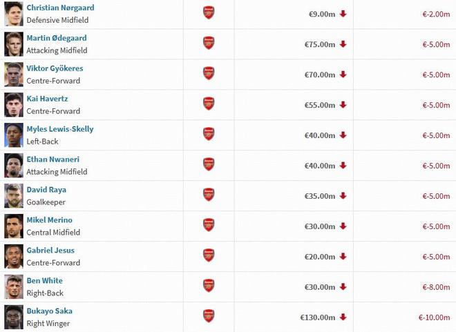 - 阿森纳球员身价变动:萨利巴上涨1000万欧,萨卡下跌1000万欧