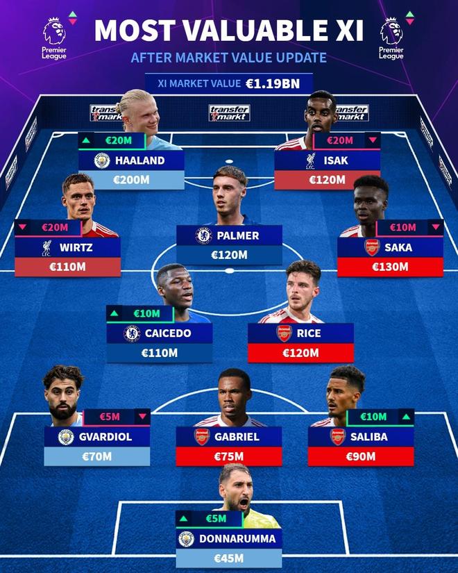 - 德转列英超最贵阵:哈兰德2亿欧领衔,枪手4人红军蓝军各2人