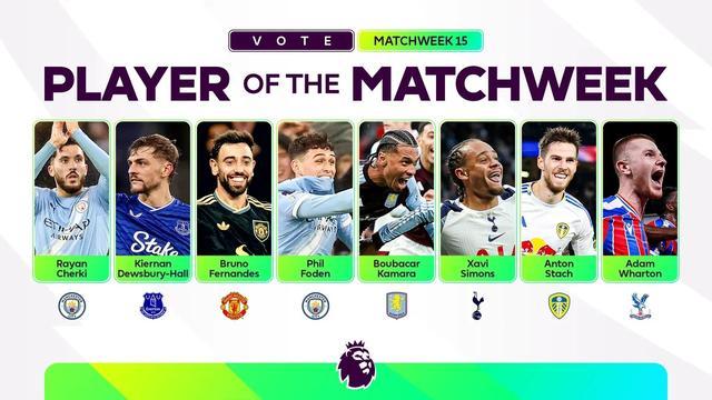 北京时间12月9日,英超官方公布了联赛第15轮最佳球员候选名单,这8名球员为谢尔基、霍尔、布鲁诺-费尔南德斯、福登、卡马拉、哈维-西蒙斯、施塔赫、亚当-沃顿。
